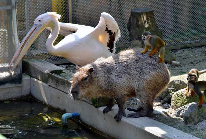 リスザルとカビバラと(たぶん)モモイロペリカンです。
