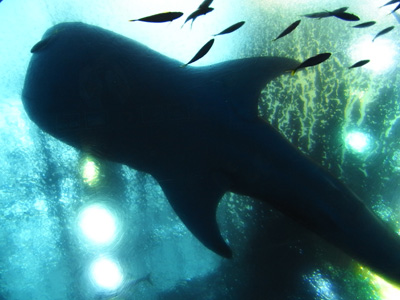 同じ水槽にはオニイトマキエイ(通称マンタ)、近所にはオオメジロザメ(人も襲っちゃうサメ)とかなり大型の魚がいますが、ジンベエザメを見た後では彼らも霞んで見えてしまう。
